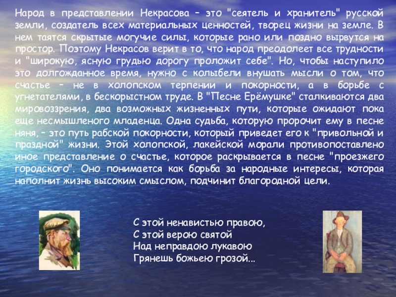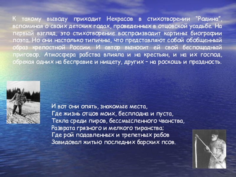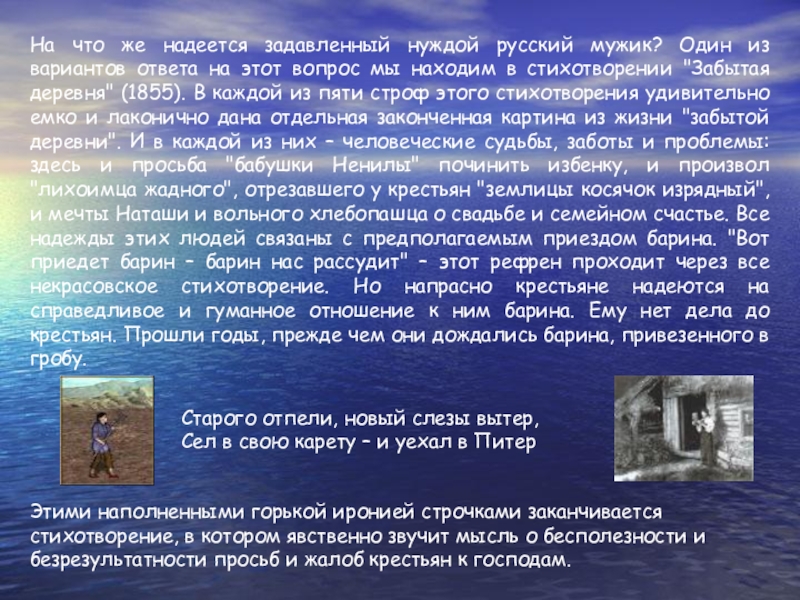 Этими наполненными горькой иронией строчками заканчивается стихотворение, в котором явственно звучит мысль о бесполезности и безрезультатности просьб и жалоб крестьян к господам.