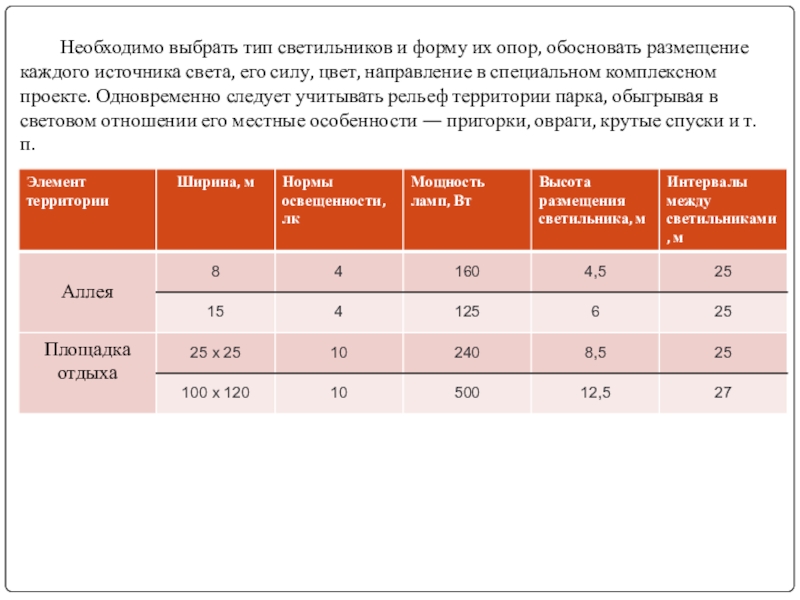 Слайд 5 Необходимо выбрать тип светильников и форму их опор, обосновать размещение каждого