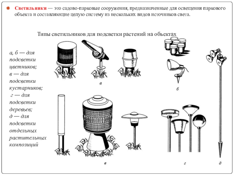 Слайд 3Светильники — это садово-парковые сооружения, предназначенные для освещения паркового объекта и составляющие