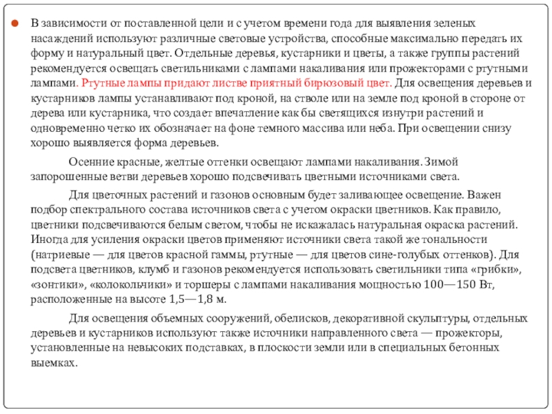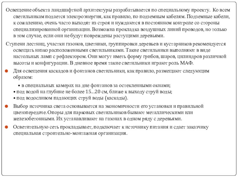 Слайд 4Освещение объекта ландшафтной архитектуры разрабатывается по специальному проекту. Ко всем светильникам