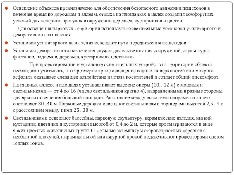 На главных аллеях и площадях устанавливают высокие опоры (10... 12 м) с мощными светильниками — от 4 до 16 (число светильников кратно 4), направленными в разные стороны для яркого освещения большой площади. Расстояние между высокими опорами на аллеях составляет 30...40 м. Парковые дорожки освещают светильниками-торшерами высотой 2,5...4 м с расстоянием между ними 25...30 м.