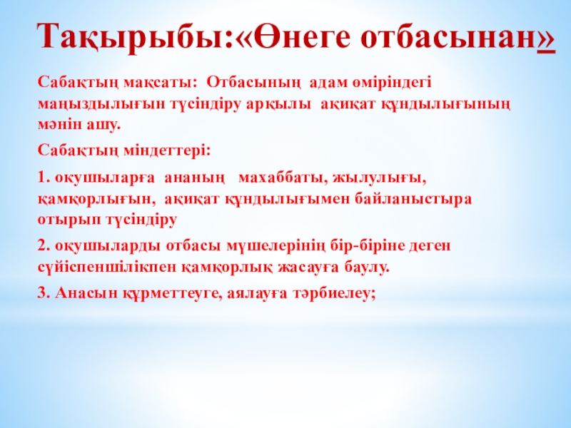 1. окушыларға ананың махаббаты, жылулығы, қамқорлығын, ақиқат құндылығымен байланыстыра отырып түсіндіру