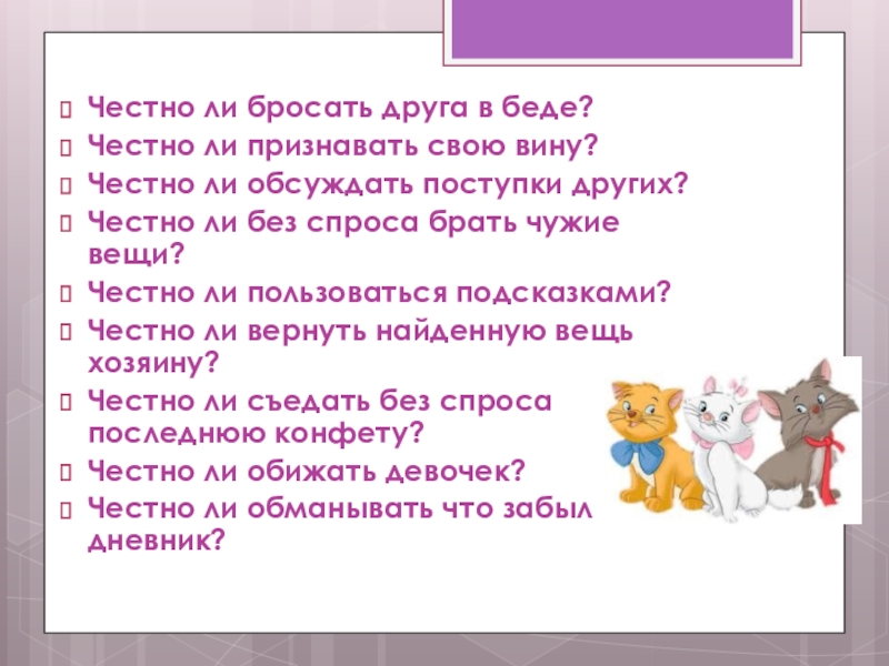 Честно ли бросать друга в беде?Честно ли признавать свою вину?Честно ли обсуждать поступки других?Честно ли без спроса