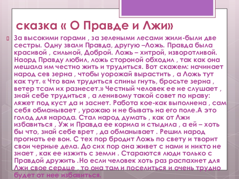 лесами жили-были две сестры. Одну звали Правда, другую –Ложь. Правда была красивой , сильной, Доброй. Ложь – хитрой, изворотливой. Наорд Правду любил, ложь стороной обходил , так как она мешала им честно жить и трудиться. Вот скажем: начинает народ сев зерна , чтобы уорожай вырастить , а Ложь тут как тут. « Что вам трудиться спины гнуть, бросьте зерна , ветер тсам их разнесет.» Честный человек ее не слушает , знай себе трудиться , а ленивому такой совет по нраву: ляжет под куст да и заснет. Работа кое-как выполнена , сам себя обманывает , урожаю и не бывать на его поле.А это голод для народа. Стал народ думать , как от Лжи избавиться , Уж и Правда ее корила и стыдила , а ей – хоть бы что, знай себе врет , да обманывает . Решил народ прогнать ее вон. С тех пор бродит Ложь по свету и творит свои черные дела. До сих пор она живет с нами и никто не знает , как ее изжить с земли . Стараются люди только с Правдой дружить .Но если человек хоть раз распахнет для Лжи свое сердце , то она там и поселиться и очень трудно будет от нее избавиться.