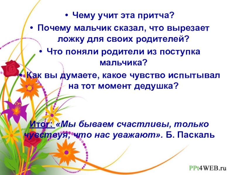 Итог: «Мы бываем счастливы, только чувствуя, что нас уважают». Б. Паскаль