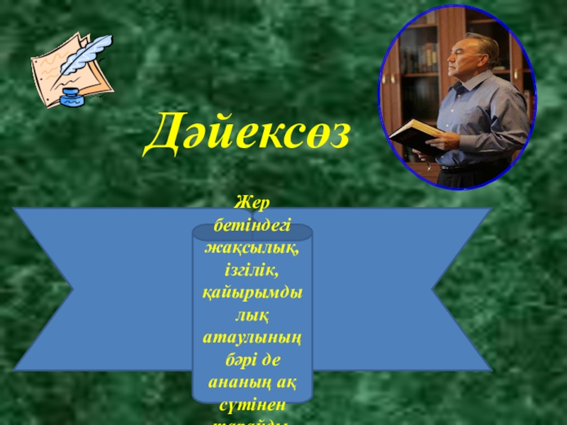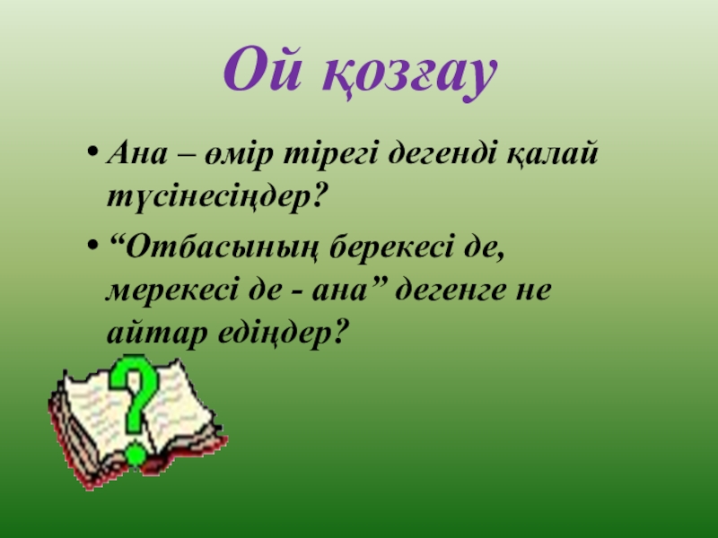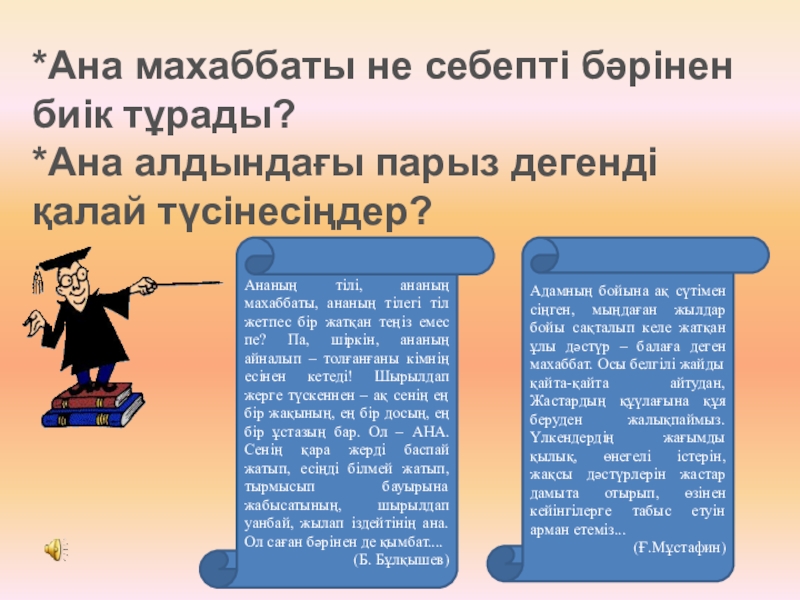 Ананың тілі, ананың махаббаты, ананың тілегі тіл жетпес бір жатқан теңіз емес пе? Па, шіркін, ананың айналып – толғанғаны кімнің есінен кетеді! Шырылдап жерге түскеннен – ақ сенің ең бір жақының, ең бір досың, ең бір ұстазың бар. Ол – АНА.Сенің қара жерді баспай жатып, есіңді білмей жатып, тырмысып бауырына жабысатының, шырылдап уанбай, жылап іздейтінің ана. Ол саған бәрінен де қымбат....