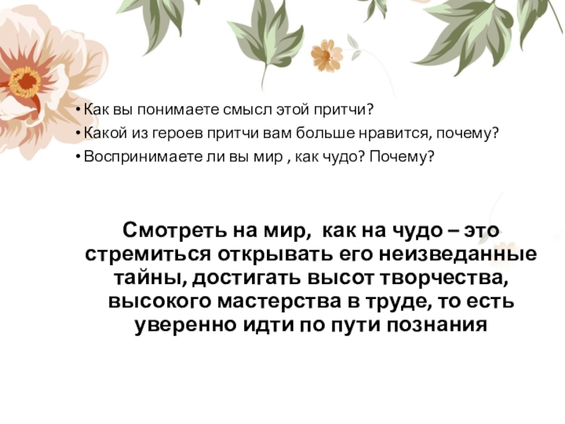 Смотреть на мир, как на чудо – это стремиться открывать его неизведанные тайны, достигать высот творчества, высокого мастерства в труде, то есть уверенно идти по пути познания
