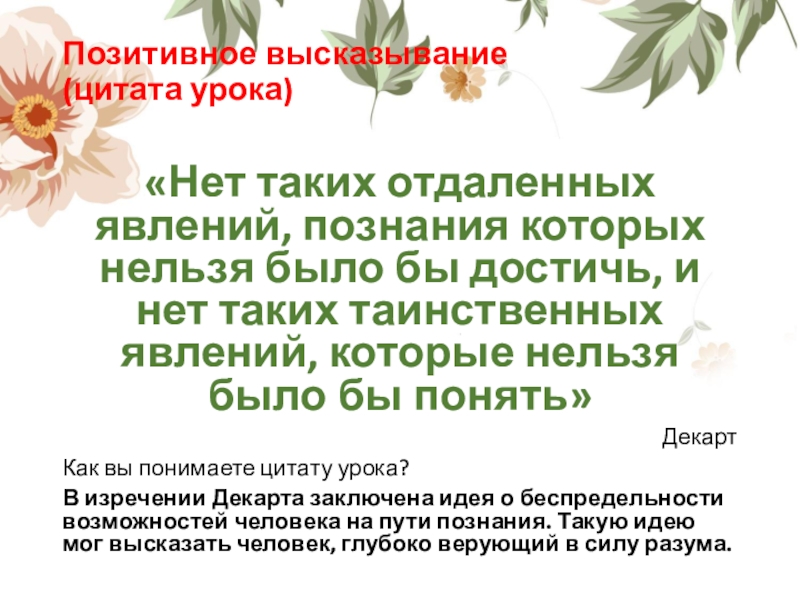В изречении Декарта заключена идея о беспредельности возможностей человека на пути познания. Такую идею мог высказать человек, глубоко верующий в силу разума.