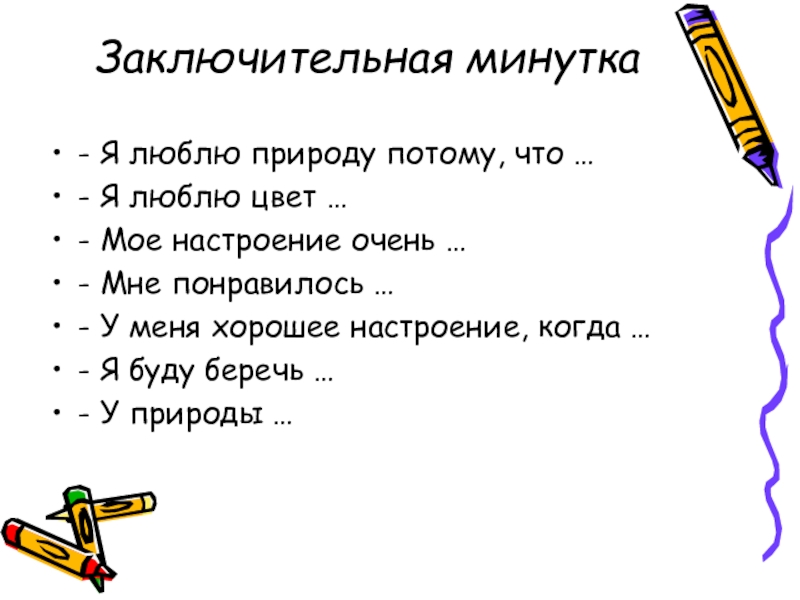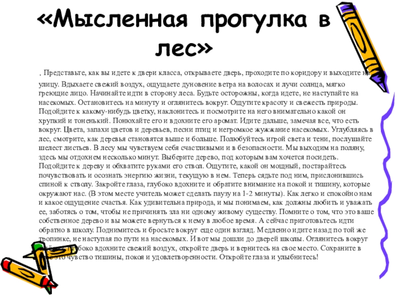 двери класса, открываете дверь, проходите по коридору и выходите на улицу. Вдыхаете свежий воздух, ощущаете дуновение ветра на волосах и лучи солнца, мягко греющие лицо. Начинайте идти в сторону леса. Будьте осторожны, когда идете, не наступайте на насекомых. Остановитесь на минуту и оглянитесь вокруг. Ощутите красоту и свежесть природы. Подойдите к какому-нибудь цветку, наклонитесь и посмотрите на него внимательно какой он хрупкий и тоненький. Понюхайте его и вдохните его аромат. Идите дальше, замечая все, что есть вокруг. Цвета, запахи цветов и деревьев, песни птиц и негромкое жужжание насекомых. Углубляясь в лес, смотрите, как деревья становятся выше и больше. Полюбуйтесь игрой света и тени, послушайте шелест листьев. В лесу мы чувствуем себя счастливыми и в безопасности. Мы выходим на поляну, здесь мы отдохнем несколько минут. Выберите дерево, под которым вам хочется посидеть. Подойдите к дереву и обхватите руками его ствол. Ощутите, какой он мощный, постарайтесь почувствовать и осознать энергию жизни, текущую в нем. Теперь сядьте под ним, прислонившись спиной к стволу. Закройте глаза, глубоко вдохните и обратите внимание на покой и тишину, которые окружают нас. (В этом месте учитель может сделать паузу на 1-2 минуты). Как легко и спокойно нам и какое ощущение счастья. Как удивительна природа, и мы понимаем, как должны любить и уважать ее, заботясь о том, чтобы не причинять зла ни одному живому существу. Помните о том, что это ваше собственное дерево и вы можете вернуться к нему в любое время. А сейчас приготовьтесь идти обратно в школу. Поднимитесь и бросьте вокруг еще один взгляд. Медленно идите назад по той же тропинке, не наступая по пути на насекомых. И вот мы дошли до дверей школы. Оглянитесь вокруг ещё раз, глубоко вдохните свежий воздух, откройте дверь и вернитесь на свое место. Сохраните в себе это чувство тишины, покоя и удовлетворенности. Откройте глаза и улыбнитесь!