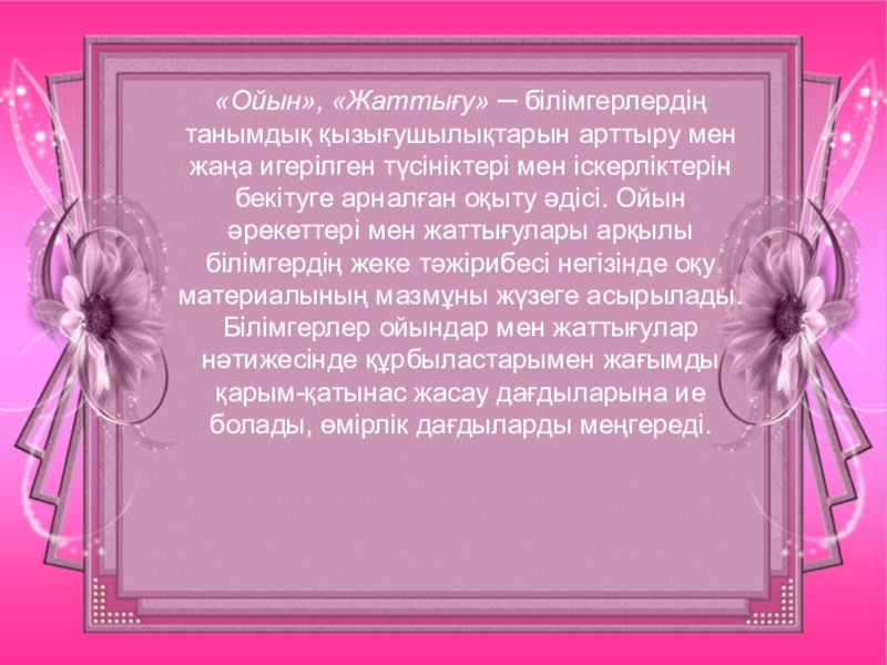 Слайд 17«Ойын», «Жаттығу» ─ білімгерлердің танымдық қызығушылықтарын арттыру мен жаңа игерілген түсініктері мен