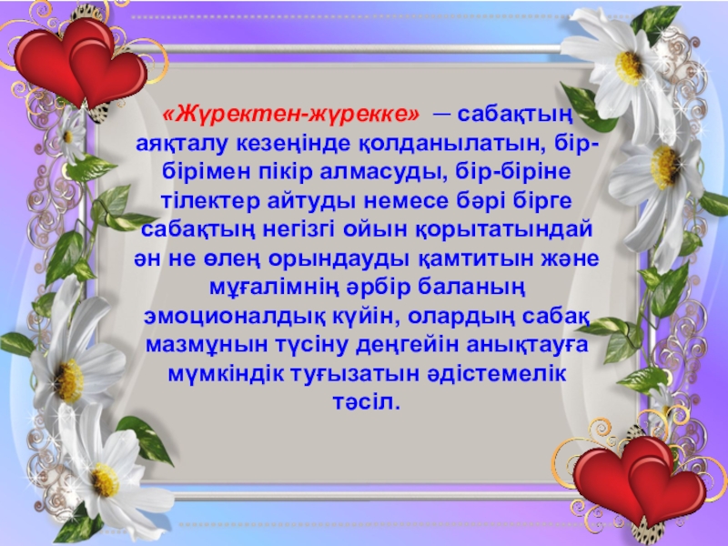 Слайд 26«Жүректен-жүрекке» ─ сабақтың аяқталу кезеңінде қолданылатын, бір-бірімен пікір алмасуды, бір-біріне тілектер айтуды немесе