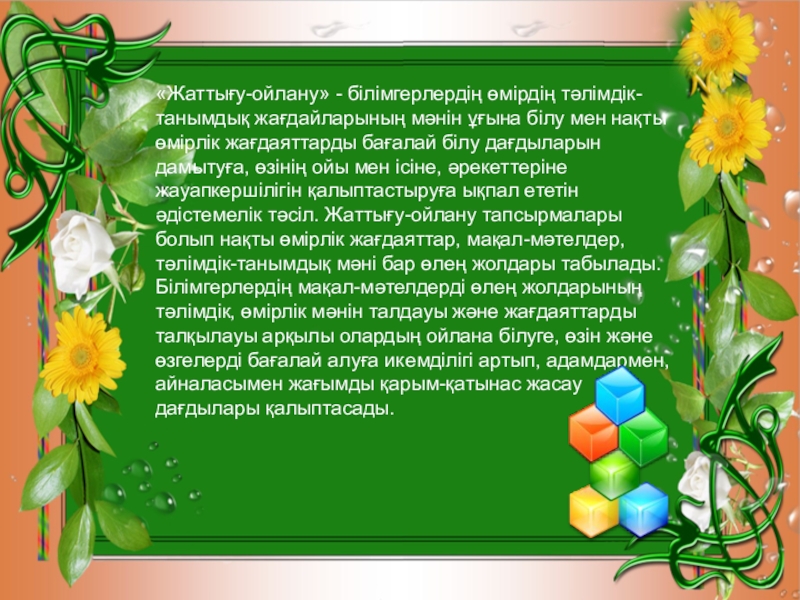 Слайд 21«Жаттығу-ойлану» - білімгерлердің өмірдің тәлімдік-танымдық жағдайларының мәнін ұғына білу мен нақты өмірлік жағдаяттарды