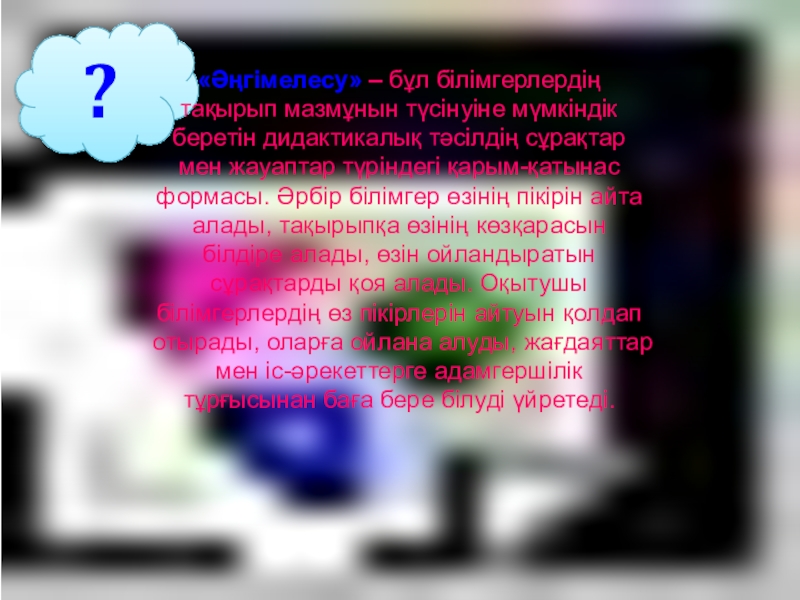 «Әңгімелесу» – бұл білімгерлердің тақырып мазмұнын түсінуіне мүмкіндік беретін дидактикалық тәсілдің сұрақтар