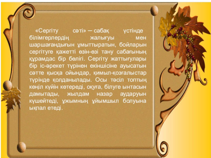 Слайд 24«Сергіту сәті» ─ сабақ үстінде білімгерлердің жалығуы мен шаршағандығын ұмыттыратын, бойларын сергітуге қажетті