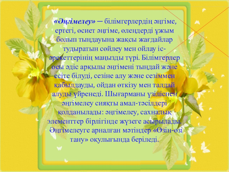 Слайд 13 «Әңгімелеу» ─ білімгерлердің әңгіме, ертегі, өсиет әңгіме, өлеңдерді ұжым болып тыңдауына