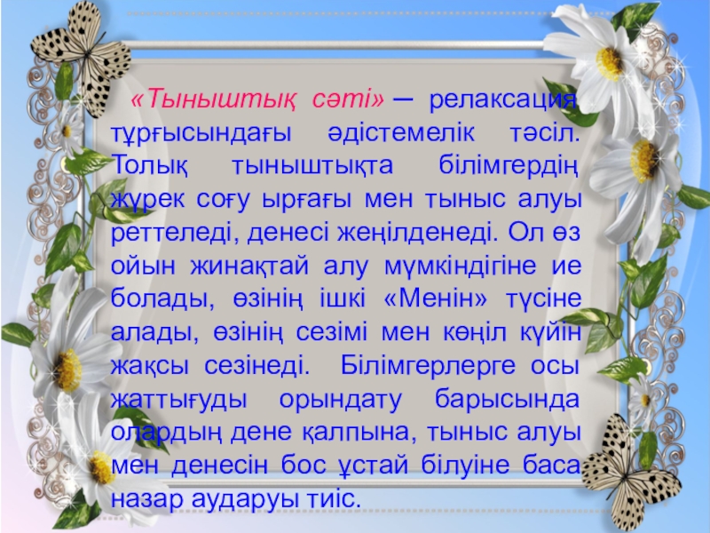 Слайд 6«Тыныштық сәті» ─ релаксация тұрғысындағы әдістемелік тәсіл. Толық тыныштықта білімгердің жүрек соғу