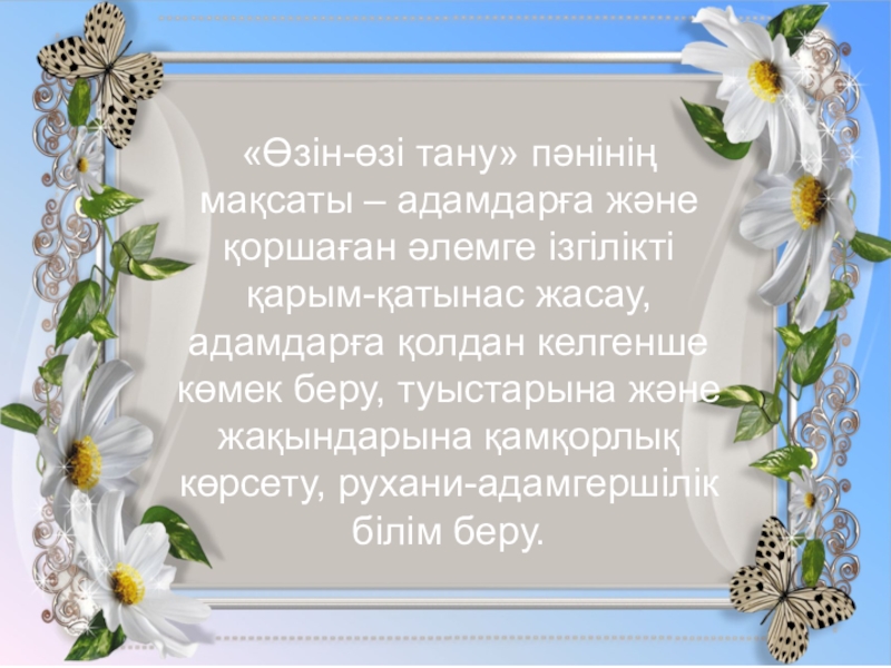 Слайд 2«Өзін-өзі тану» пәнінің мақсаты – адамдарға және қоршаған әлемге ізгілікті қарым-қатынас