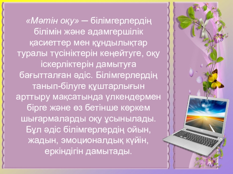 Слайд 9«Мәтін оқу» ─ білімгерлердің білімін және адамгершілік қасиеттер мен құндылықтар туралы түсініктерін