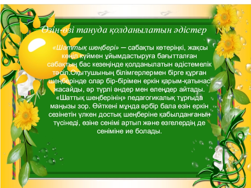 Слайд 4 «Шаттық шеңбері» ─ сабақты көтеріңкі, жақсы көңіл күймен ұйымдастыруға бағытталған сабақтың бас