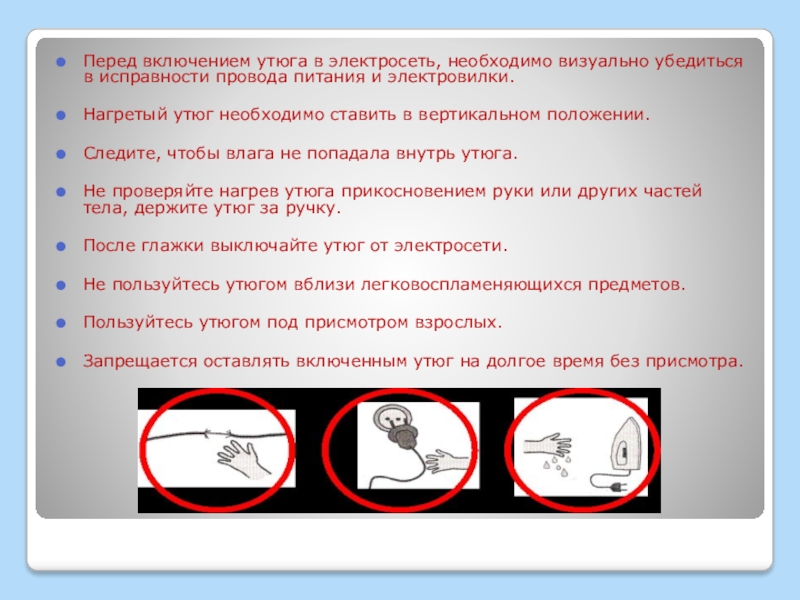 Слайд 12Перед включением утюга в электросеть, необходимо визуально убедиться в исправности провода