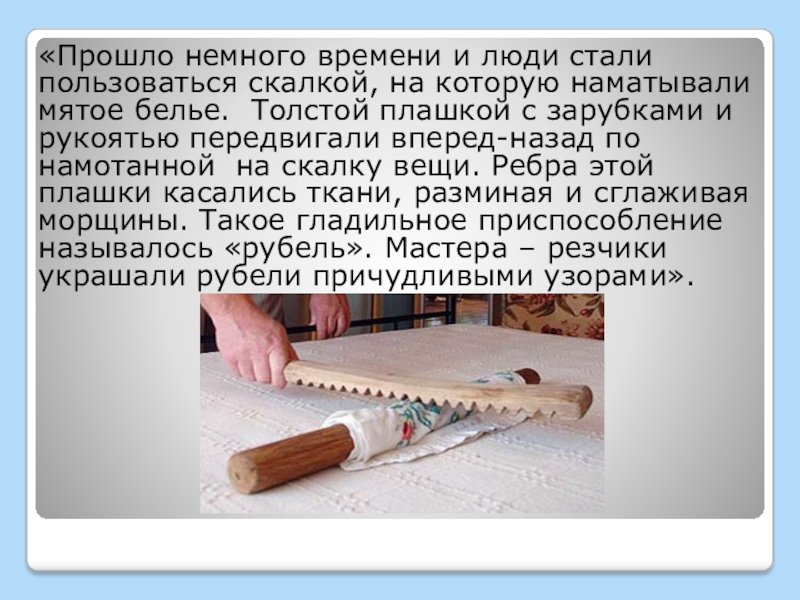 мятое белье. Толстой плашкой с зарубками и рукоятью передвигали вперед-назад по намотанной на скалку вещи. Ребра этой плашки касались ткани, разминая и сглаживая морщины. Такое гладильное приспособление называлось «рубель». Мастера – резчики украшали рубели причудливыми узорами».