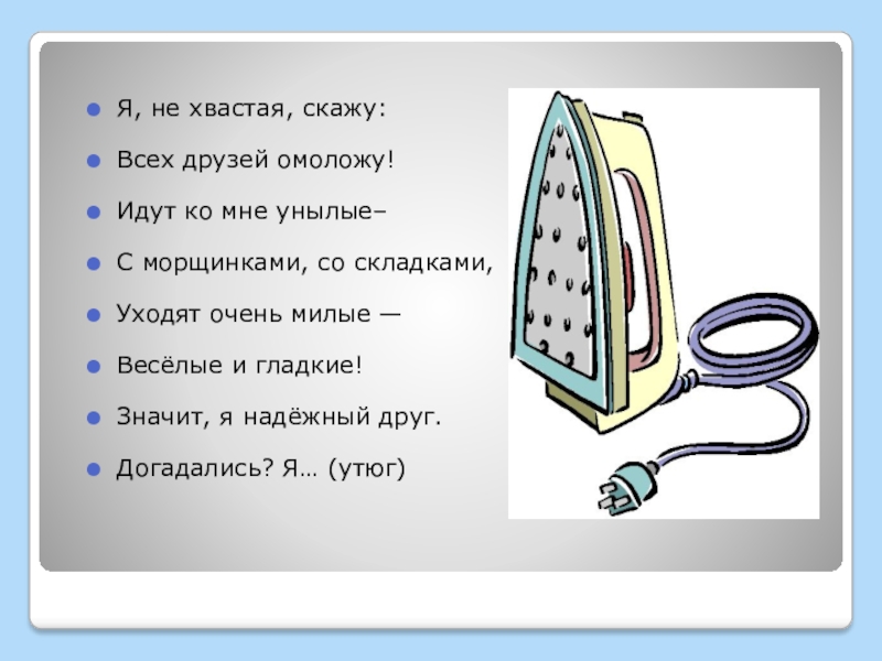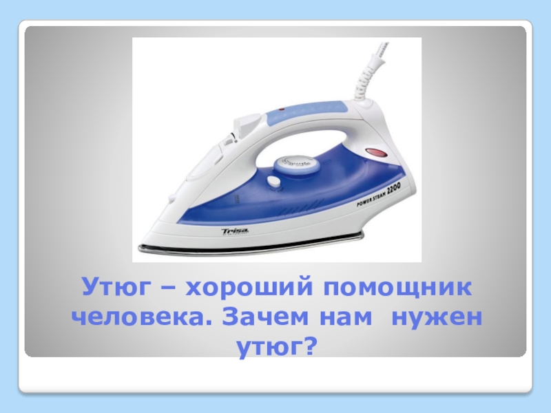 Слайд 3Утюг – хороший помощник человека. Зачем нам нужен утюг?