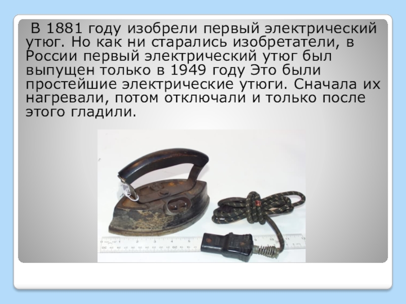 Слайд 9 В 1881 году изобрели первый электрический утюг. Но как ни