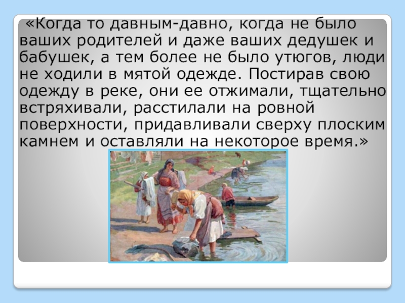 ваших дедушек и бабушек, а тем более не было утюгов, люди не ходили в мятой одежде. Постирав свою одежду в реке, они ее отжимали, тщательно встряхивали, расстилали на ровной поверхности, придавливали сверху плоским камнем и оставляли на некоторое время.»