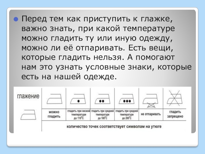 Слайд 15Перед тем как приступить к глажке, важно знать, при какой температуре