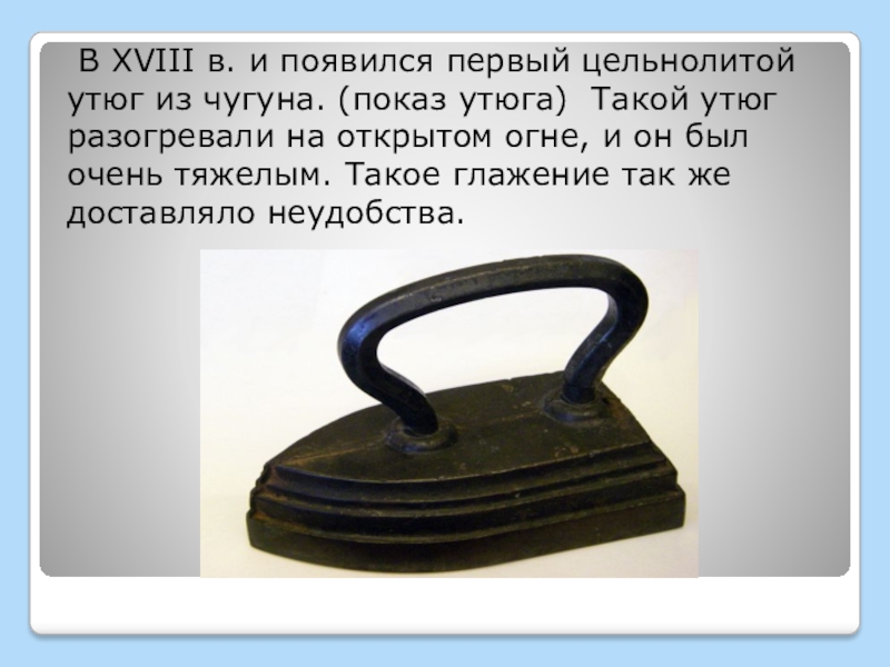 Слайд 7 В XVIII в. и появился первый цельнолитой утюг из чугуна.