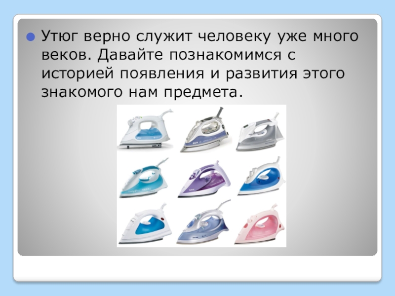 Слайд 4Утюг верно служит человеку уже много веков. Давайте познакомимся с историей
