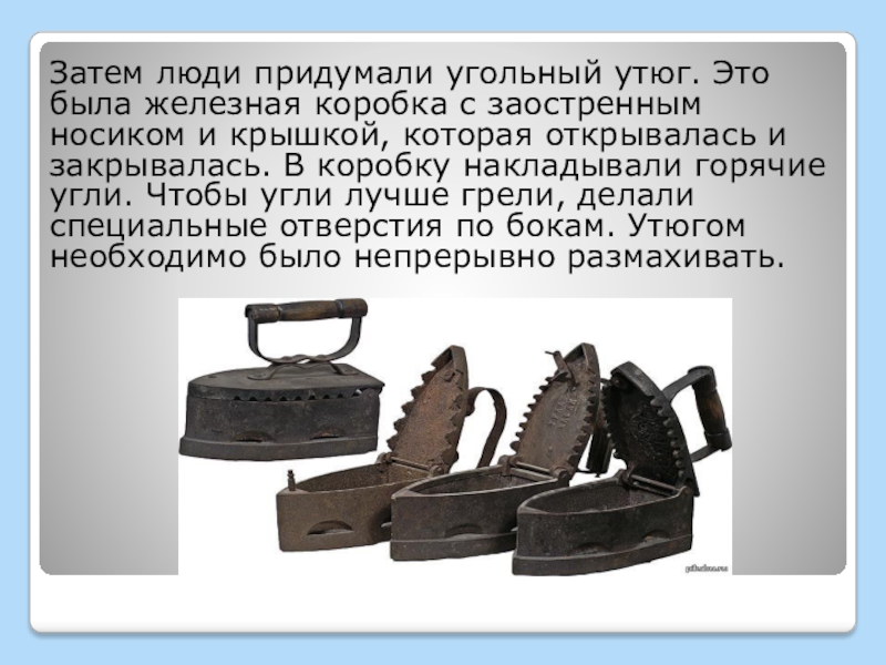 Слайд 8Затем люди придумали угольный утюг. Это была железная коробка с заостренным
