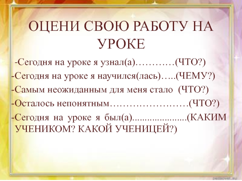 -Сегодня на уроке я узнал(а)…………(ЧТО?)