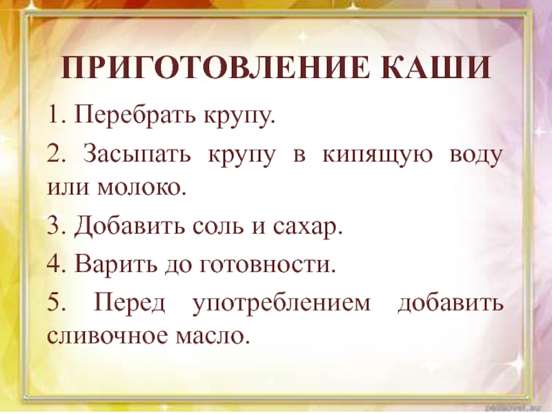 ПРИГОТОВЛЕНИЕ КАШИ1. Перебрать крупу.2. Засыпать крупу в кипящую воду или молоко.3. Добавить соль и сахар.4. Варить до