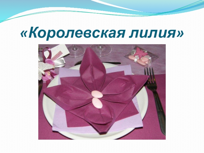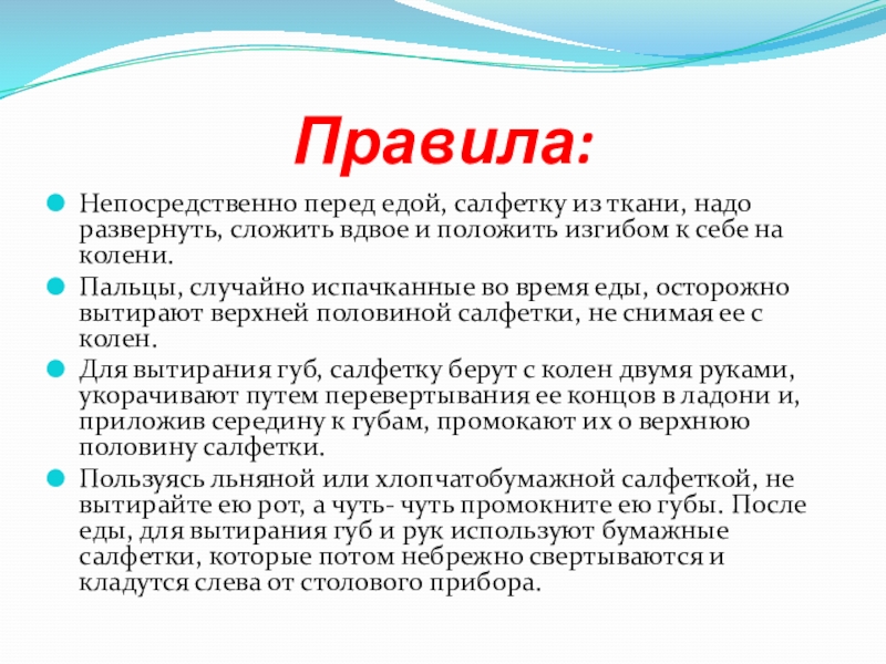 Правила:Непосредственно перед едой, салфетку из ткани, надо развернуть, сложить вдвое и положить изгибом к себе на колени.Пальцы,
