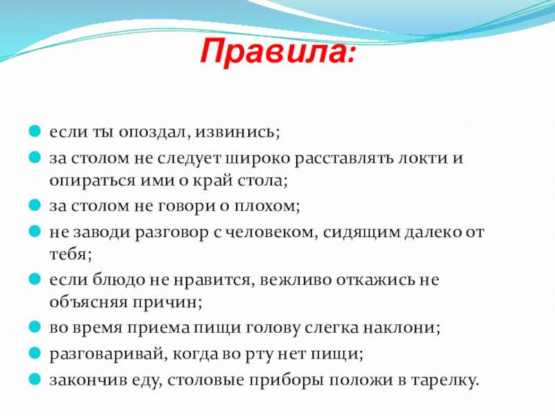 Правила: если ты опоздал, извинись;за столом не следует широко расставлять локти и опираться ими о край стола;за