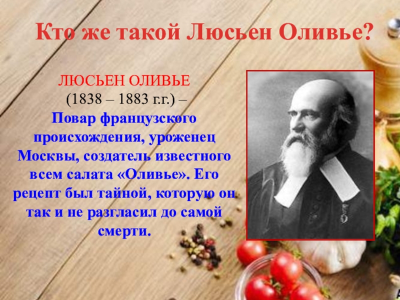 Кто же такой Люсьен Оливье?ЛЮСЬЕН ОЛИВЬЕ (1838 – 1883 г.г.) –Повар французского происхождения, уроженец Москвы, создатель известного