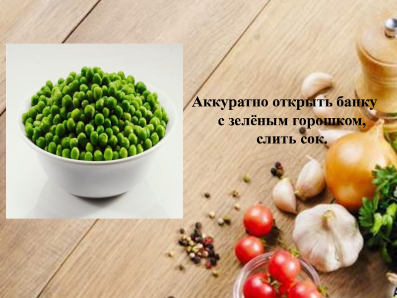 Слайд 23Аккуратно открыть банку с зелёным горошком, слить сок.