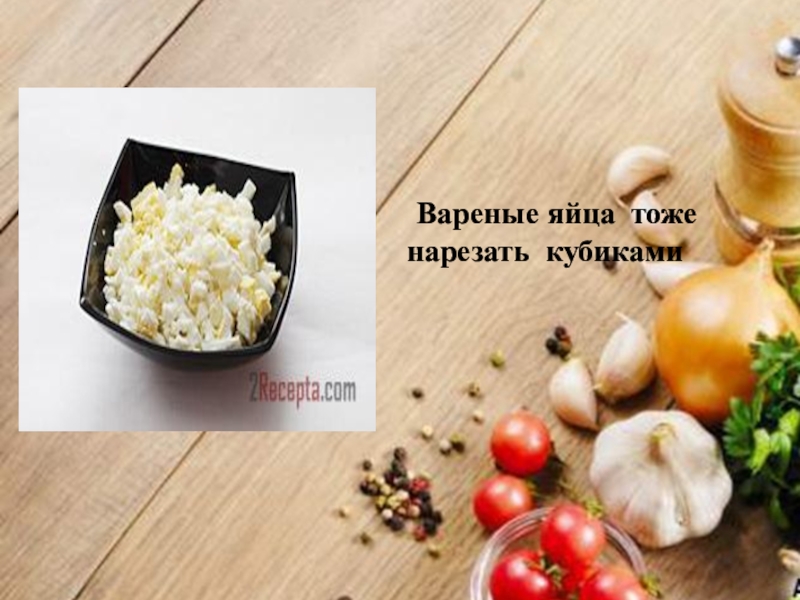 Слайд 22 Вареные яйца тоже нарезать кубиками