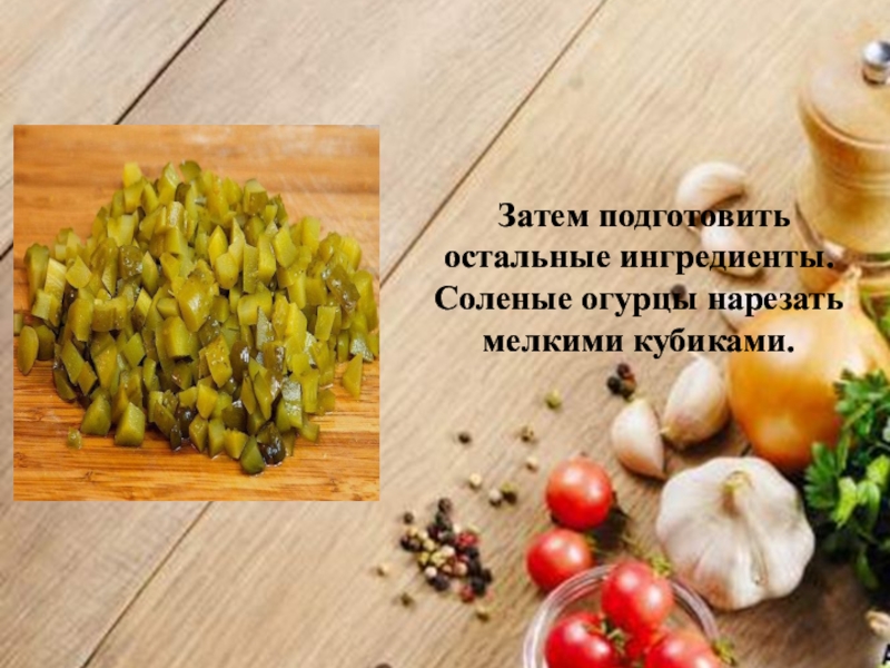 Слайд 20 Затем подготовить остальные ингредиенты. Соленые огурцы нарезать мелкими кубиками.