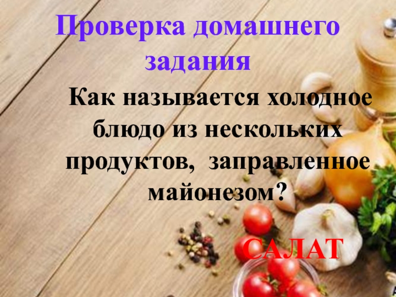 Проверка домашнего заданияСАЛАТ	Как называется холодное блюдо из нескольких продуктов, заправленное майонезом?