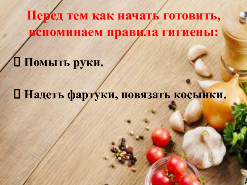 Слайд 15Перед тем как начать готовить, вспоминаем правила гигиены: