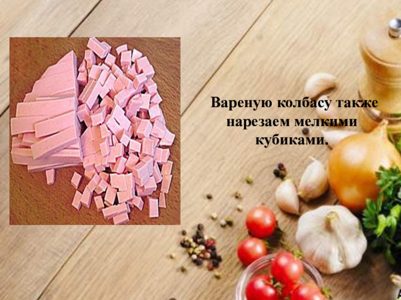 Слайд 21 Вареную колбасу также нарезаем мелкими кубиками.