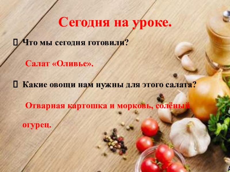 Сегодня на уроке.Что мы сегодня готовили?	Салат «Оливье».Какие овощи нам нужны для этого салата?	Отварная картошка и морковь, солёный