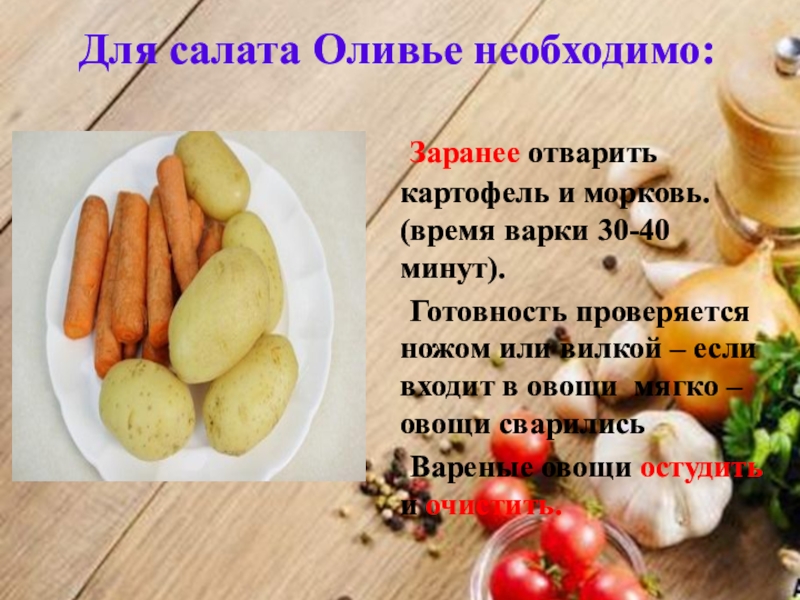 Для салата Оливье необходимо:	Заранее отварить картофель и морковь. (время варки 30-40 минут).	Готовность проверяется ножом или вилкой –