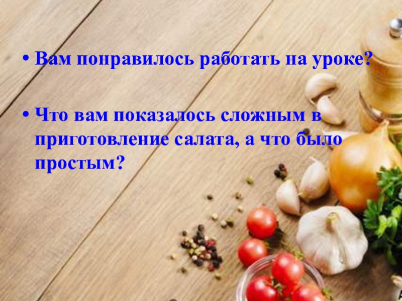 Вам понравилось работать на уроке?Что вам показалось сложным в приготовление салата, а что было простым?