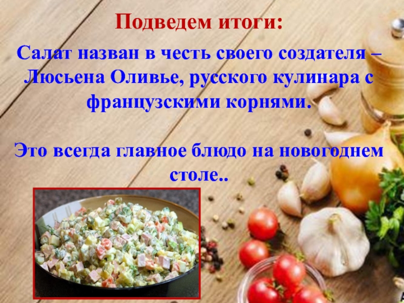 Подведем итоги:Салат назван в честь своего создателя – Люсьена Оливье, русского кулинара с французскими корнями.Это всегда главное