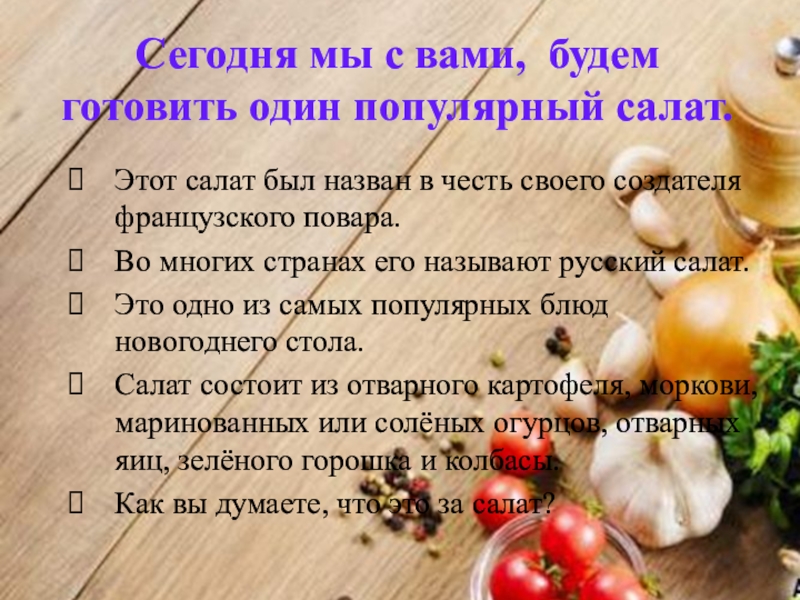 Слайд 9Сегодня мы с вами, будем готовить один популярный салат.