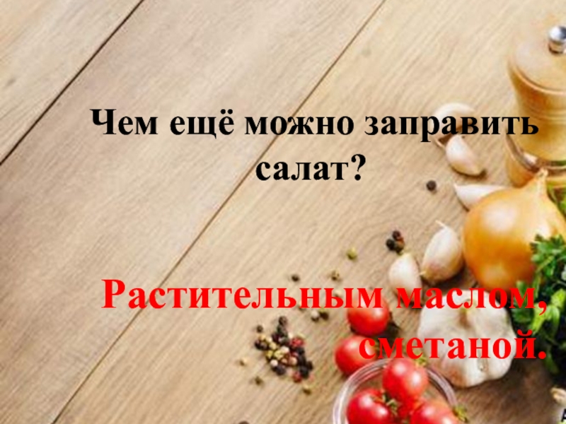 Растительным маслом, сметаной.	Чем ещё можно заправить салат?
