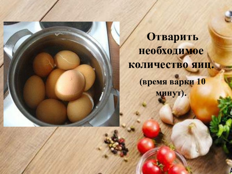 Отварить необходимое количество яиц. 	(время варки 10 минут).